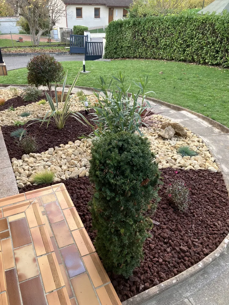 Plantation de type méditerranéenne, alliés de paillage minéral avec un concassé 30/60 beige ainsi que de la pouzzolane en 20/50.